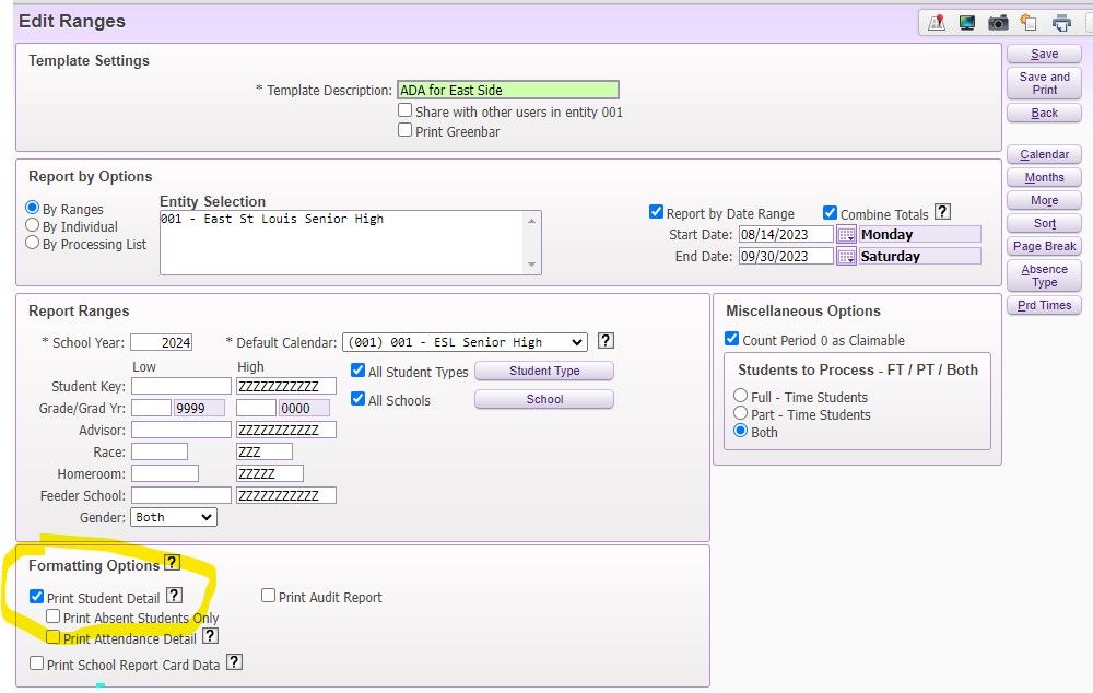 When setting up your ADA template, if you select the option to PRINT STUDENT DETAIL, you will get all relevant attendance data for your students for the specified time period.