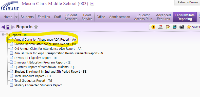 While in your entity, click on FEDERAL/ STATE REPORTING and then select REPORTS under ILLINOIS STATE REPORTING. Once there, select the ANNUAL CLAIM FOR ATTENDANCE - ADA Report.