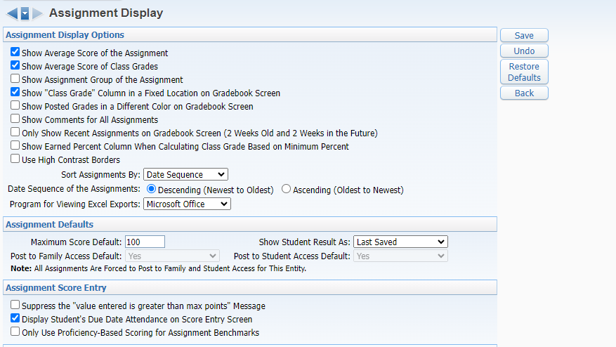 The Assignment Display allows you to establish user preferences of assignment detail information on the Gradebook Main Screen and assignment score settings. Changes made in this area will modify all your Gradebooks to reflect these settings.