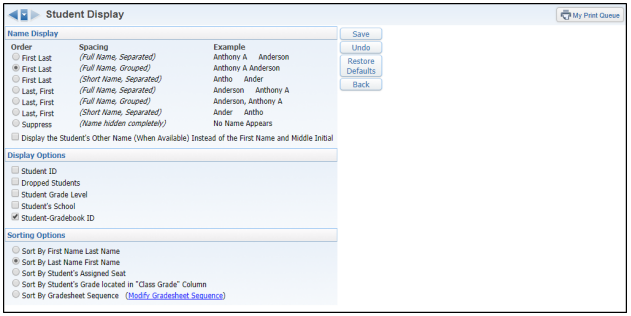 NAME DISPLAY: this allows you to determine how the student's name will display in your Gradebook.
