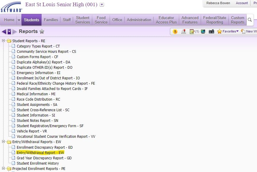 To access this report, you will need to be on the Student Management side of Skyward. Select the STUDENTS button and then scroll down to Reports. Once in Reports, you will want to find the Entry/ Withdrawal Report - EW near the bottom of your options. From here you can customize what data will be pulled.