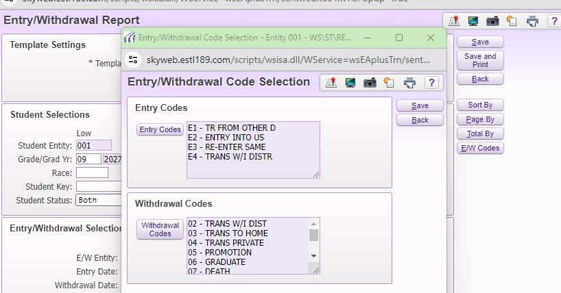 Prior to running the report, you will need to select specific Entry and Withdrawal codes. Only students with those specified entry and withdrawal codes will print on the report. Click on the E/W CODES button in the upper righthand corner to choose your codes.