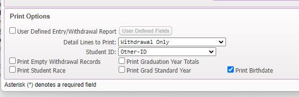 Under Entry/Withdrawal Selections, set the date ranges. Set the Entry and Withdrawal Date ranges with the school year calendar dates (school year you want the data for).
