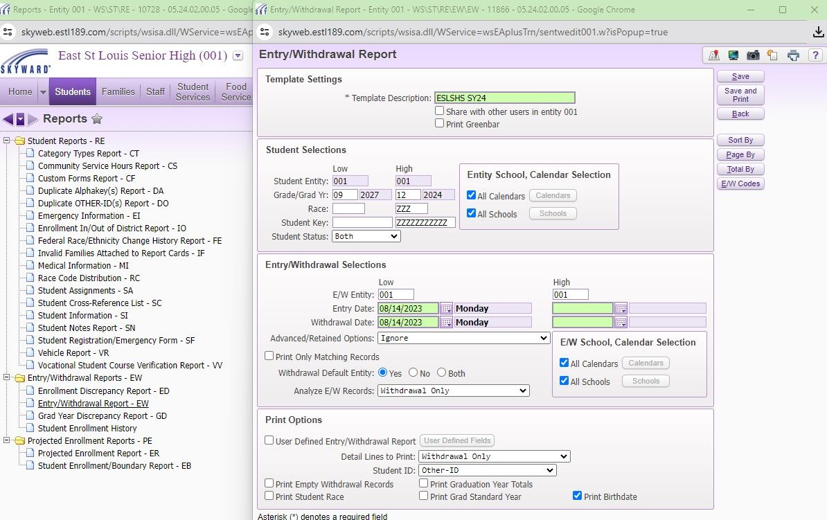 The Skyward Entry/ Withdrawal Report can be set up to provide many different types of information related Entries and Withdrawals for a specific school year.