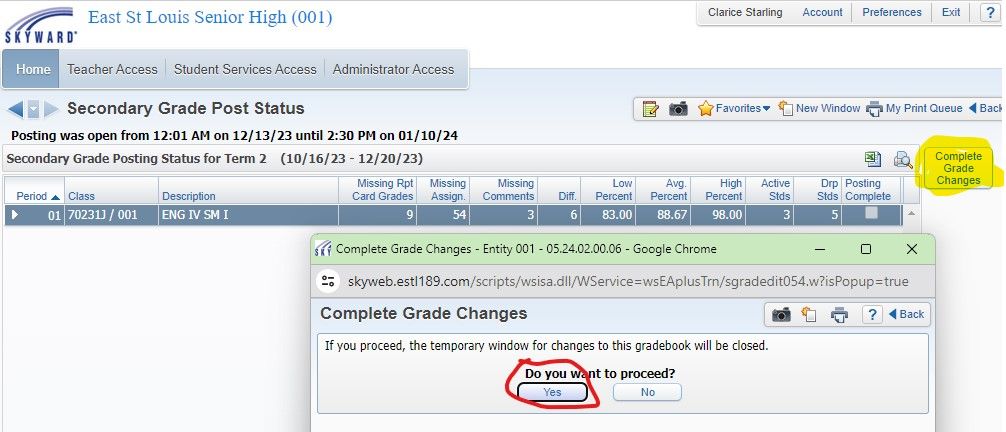 Now you have a new button to the right that says COMPLETE GRADE CHANGES. Once you hit the button, you will get a message that pops up and says the gradebook will be closed. If you are done, select YES to close the gradebook.