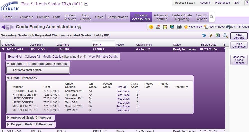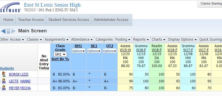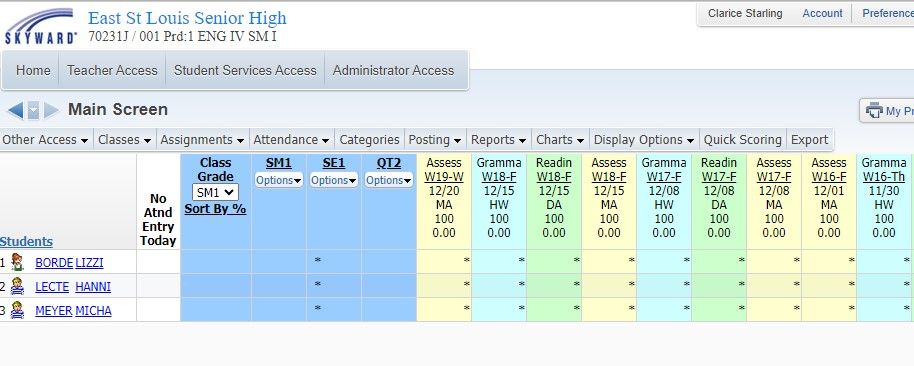 For the purposes of this tutorial, we will use Clarice Starling's 1st Semester English 4 class. She did not enter any grades during the semester and will now need to make updates for SM1 (Semester 1).