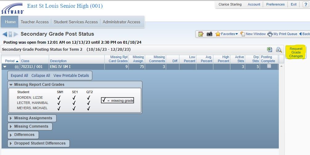 All of Ms. Starling's students are missing grades so she is going to select the REQUEST GRADE CHANGES button to the right.