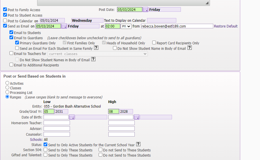 You will have a number of options for your communication, including limiting it to students in specific grade levels or courses, as well as identifying if it will post to the Family/ Student accounts in Skyward.