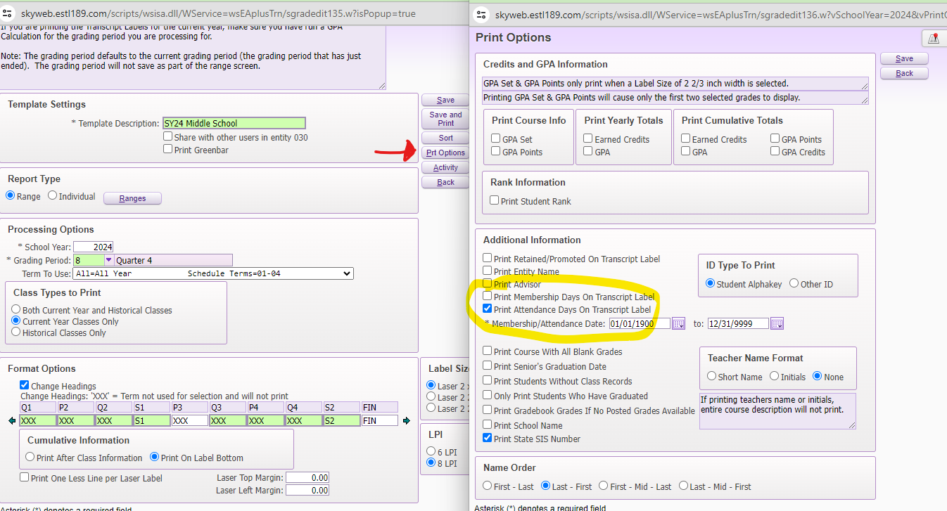 In this window, select the box to "Print Attendance Days on Transcript Label".