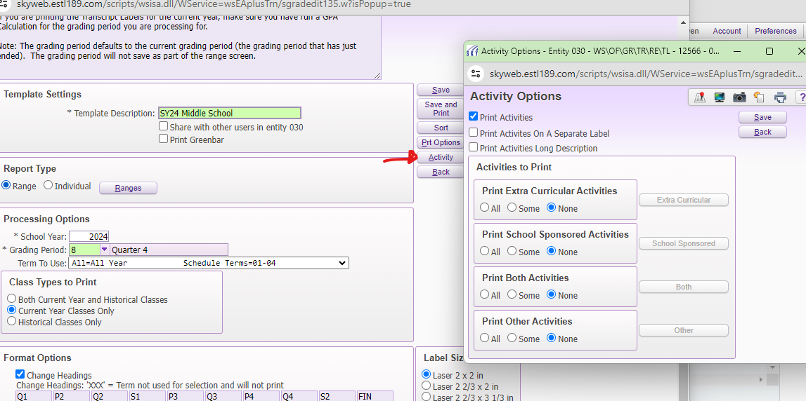 Activities have not typically been included on these labels, so you will simply select the NONE option under each selection and then hit SAVE.