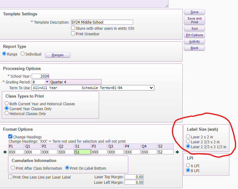 This area will also allow you to select how you want the students' names to print and the add the State SIS Number.