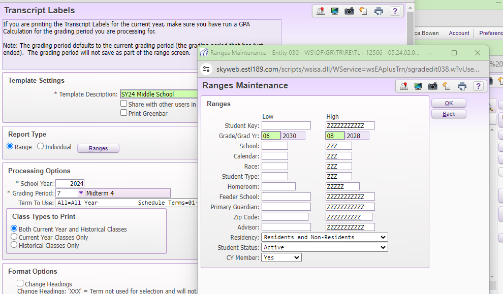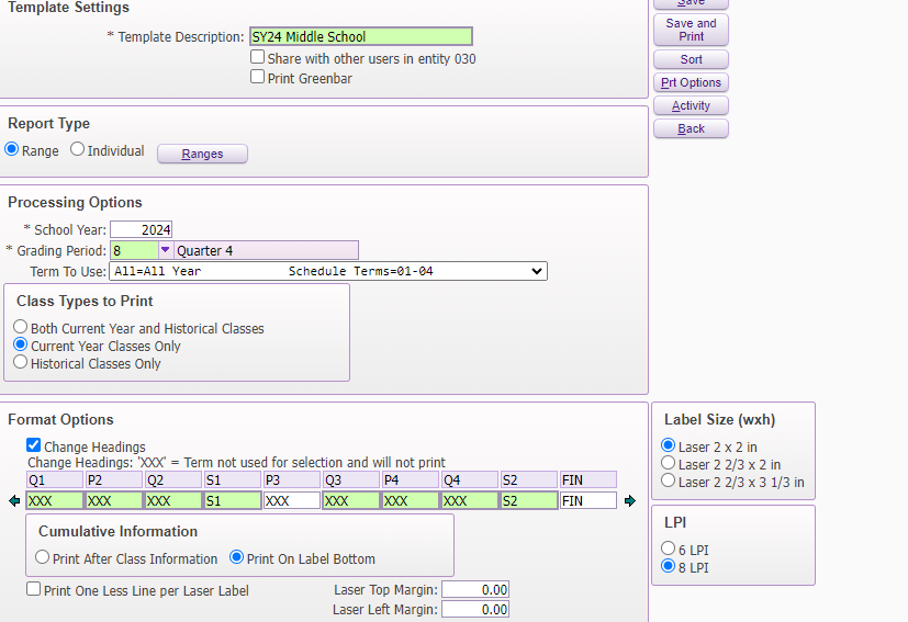 Because you are printing these each year, you want to select the CURRENT YEAR CLASSES ONLY. And because you are doing this for the end of the year, select the grading period to be Quarter 4.