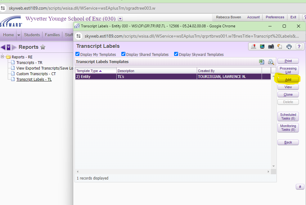 If you need to create a new template, select the ADD button. From here you will set up the labels.