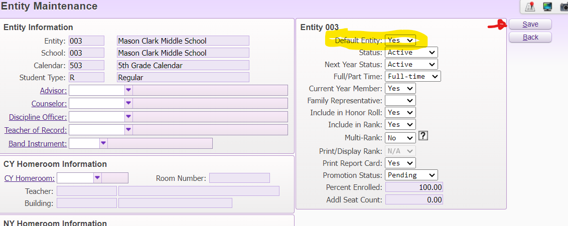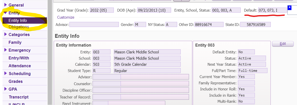 For the picture shown, the student now has an active entry record at MCMS (003) but still has Wright Elementary (073) as the default. This will need to be updated so that MCMS (003) is the default entity.