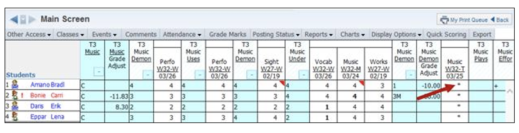 You can score an event by clicking on either the *(asterisk) or the number in the score cell.
