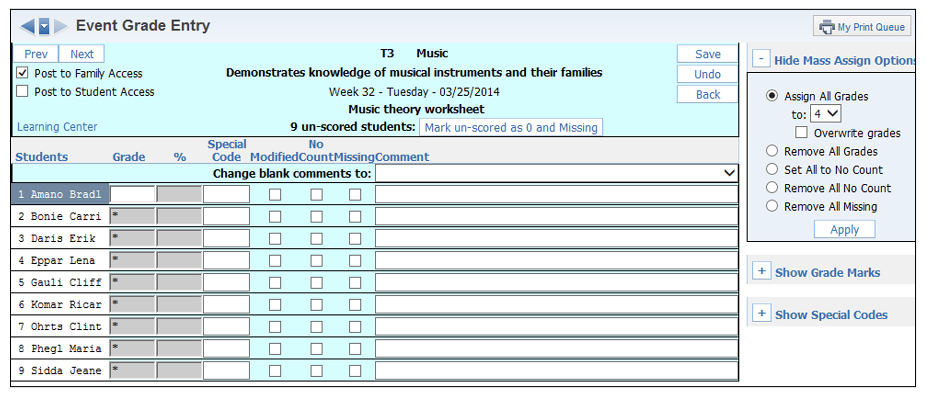 The student’s score cell that you clicked on in the Gradebook Main Screen is the cell it will bring you to in the Event Grade Entry screen. You can find more information regarding the Event Grade Entry screen in the Scoring Events from List Events section of this guide.