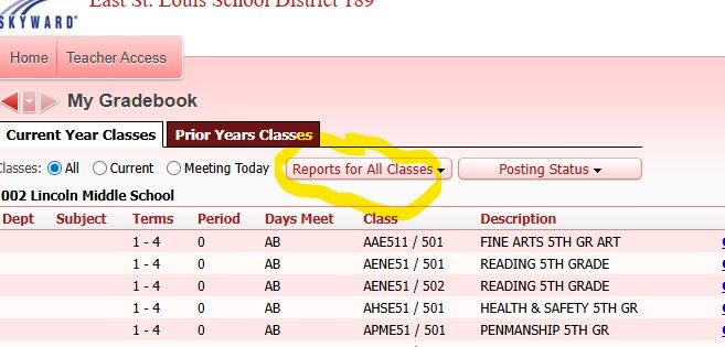 To print rosters for all your classes, log into Skyward and select MY GRADEBOOK - MG under the Teacher Access options. Once you are there, you will see a list of your scheduled classes.