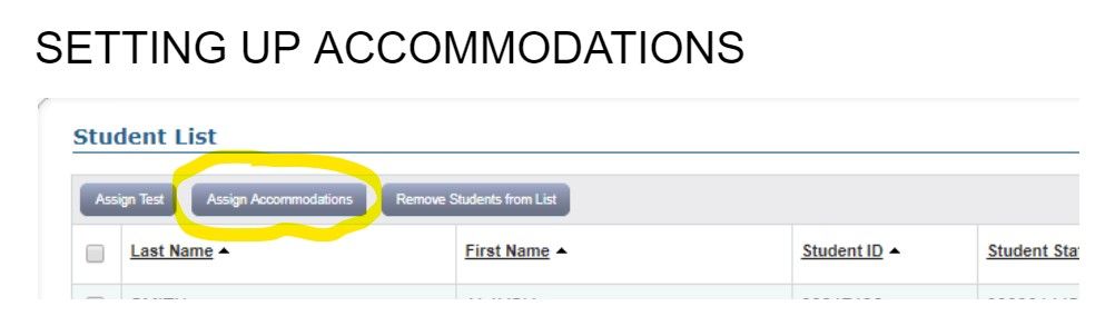 Once you have set up the testing session and assigned the tests for students, click on a student's name and select the ASSIGN ACCOMMODATIONS button.